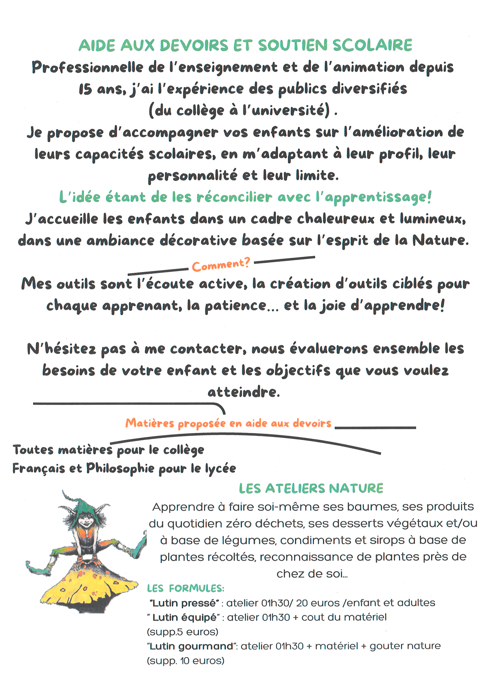 Ateliers pour apprendre à faire soi-même ses baumes, ses produits du quotidien, ses desserts végétaux et/ou à base de légumes, ses condiments et sirops à base de plantes récoltées, reconnaissance de plantes près de chez soi, goûters nature, aide aux devoirs et soutien scolaire...
