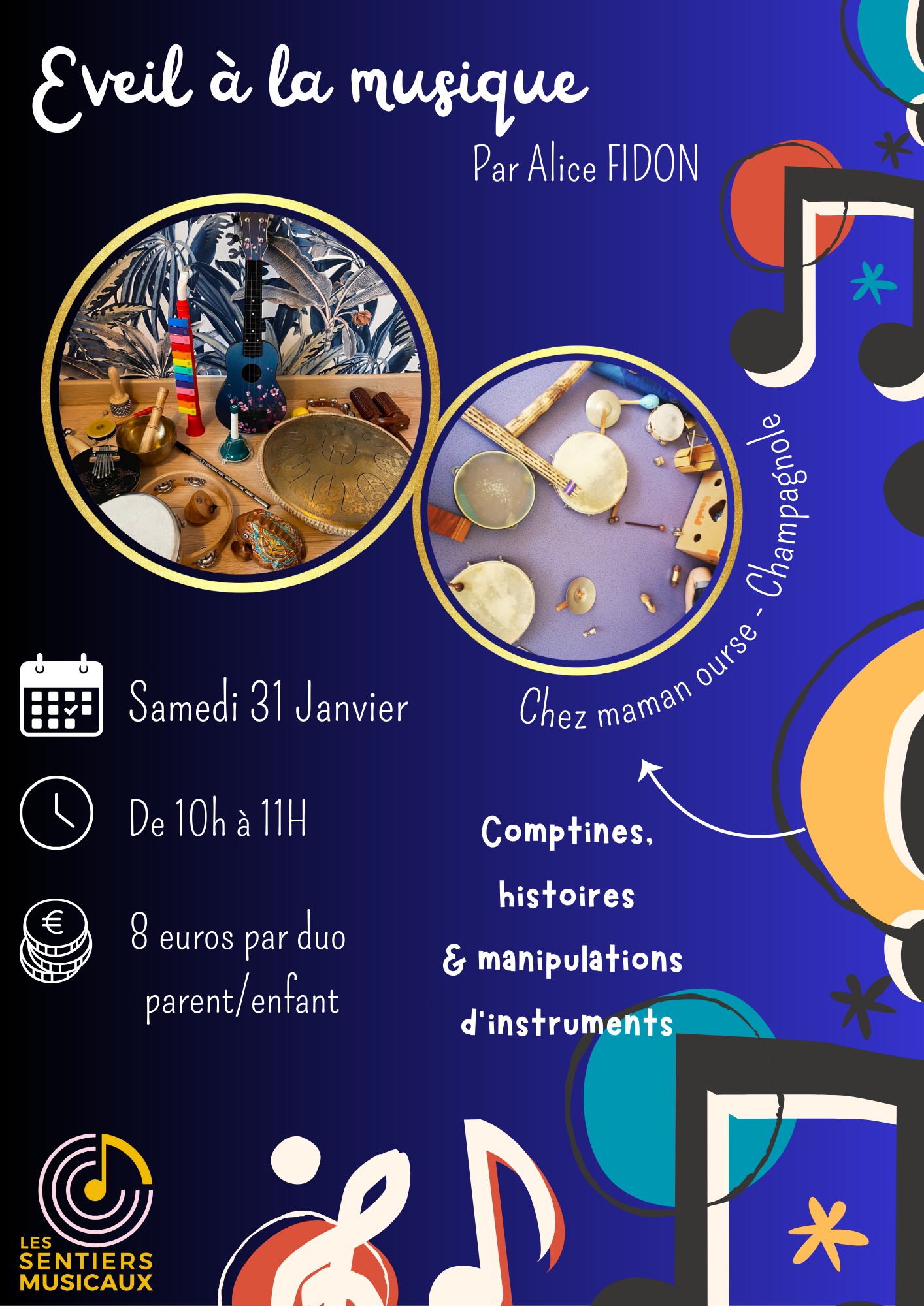 Par Alice Fidon. Comptines, histoires et manipulations d'instruments.