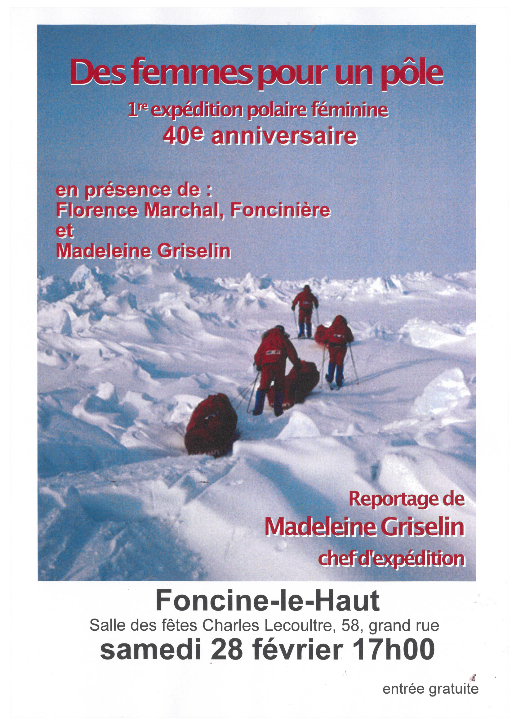 A l'occasion du 40e anniversaire de la 1ère expédition polaire féminine. En présence de Florence Marchal, Foncinière et Madeleine Griselin (Chef de l'expédition). 60 jours à ski sur la banquise, 600 km parcourus de février à mai 1986. Deux heures d'aventure à la découverte du milieu polaire. Entrée gratuite.