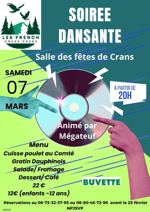 Soirée dansante animée par Mégateuf à partir de 20 h. Au menu, cuisses de poulet au comté, gratin dauphinois, salade, fromage, dessert et café + 1 menu enfants - 12ans