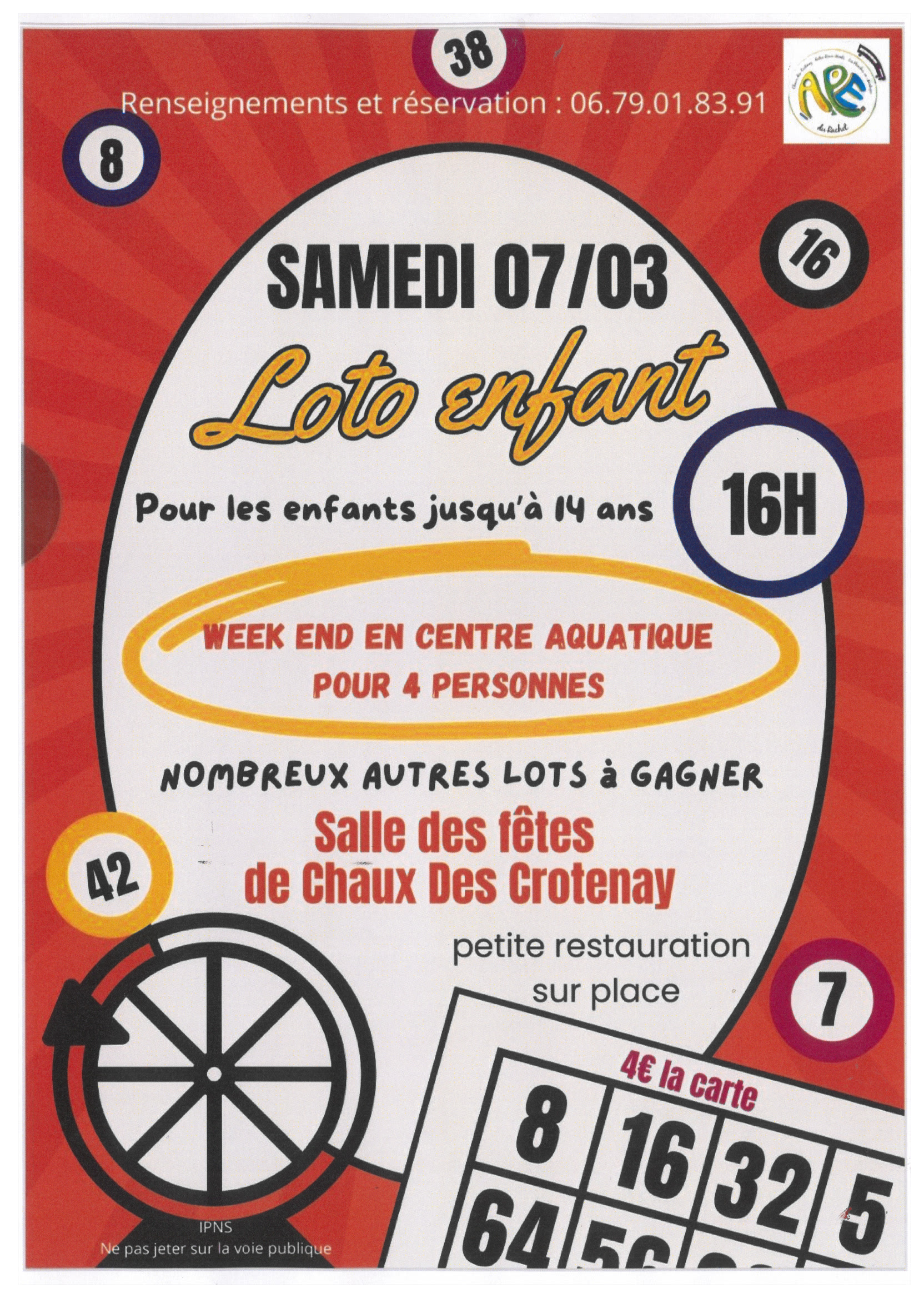 Loto réservé aux enfants jusqu'à 14 ans. Nombreux lots à gagner dont un week-end en centre aquatique pour 4 personnes. Petite restauration sur place.