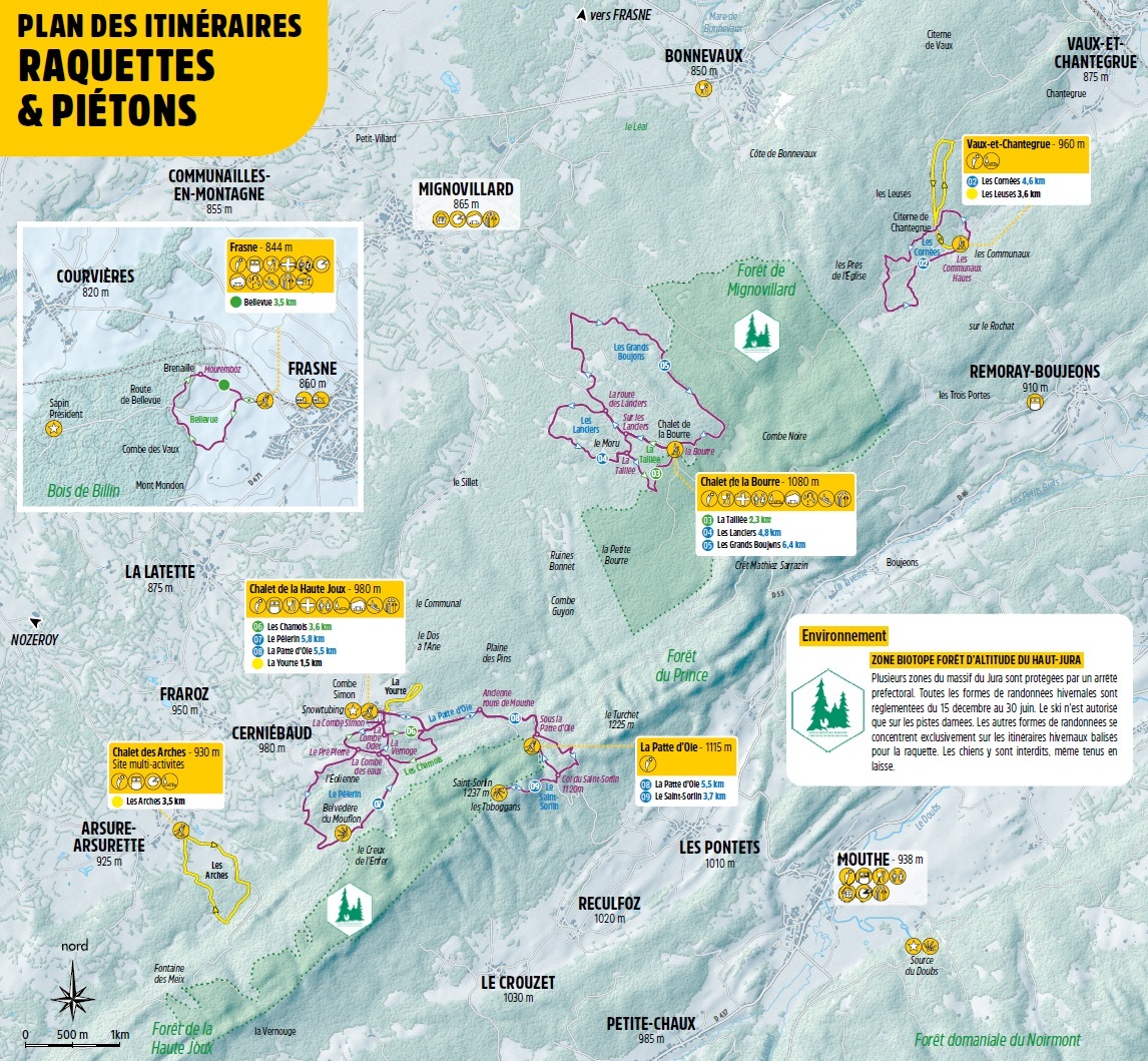 Cette station familiale est particulièrement adaptée aux visiteurs en quête d'authenticité, soucieux d'éviter la foule des grandes stations. Au cœur d'une nature préservée et d'une des plus belles sapinières d'Europe, chacun peut s'adonner en toute simplicité à la raquette sur les 9 sentiers du domaine de la Haute-Joux.