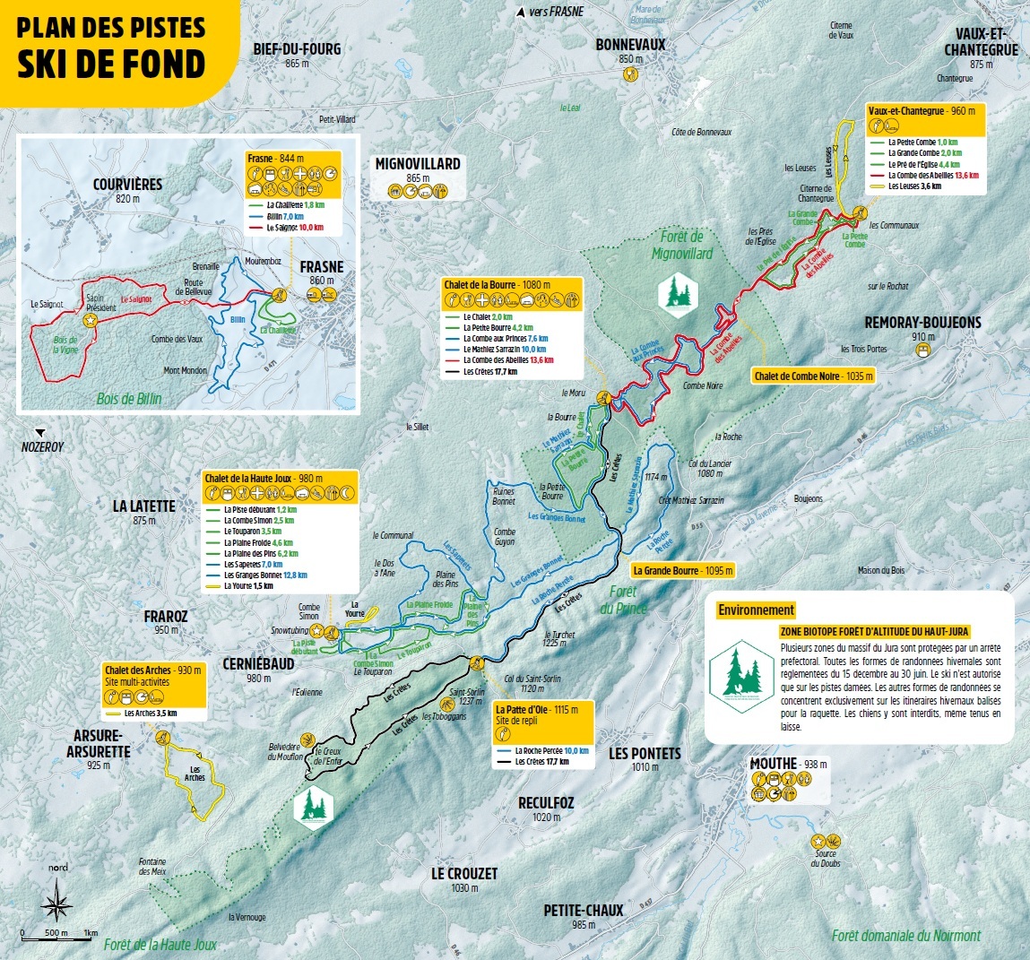 Sur un immense plateau vallonné, entre combes et forêts d'épicéas, les domaines nordiques de la Haute-Joux et de Foncine-le-Haut vous accueillent.