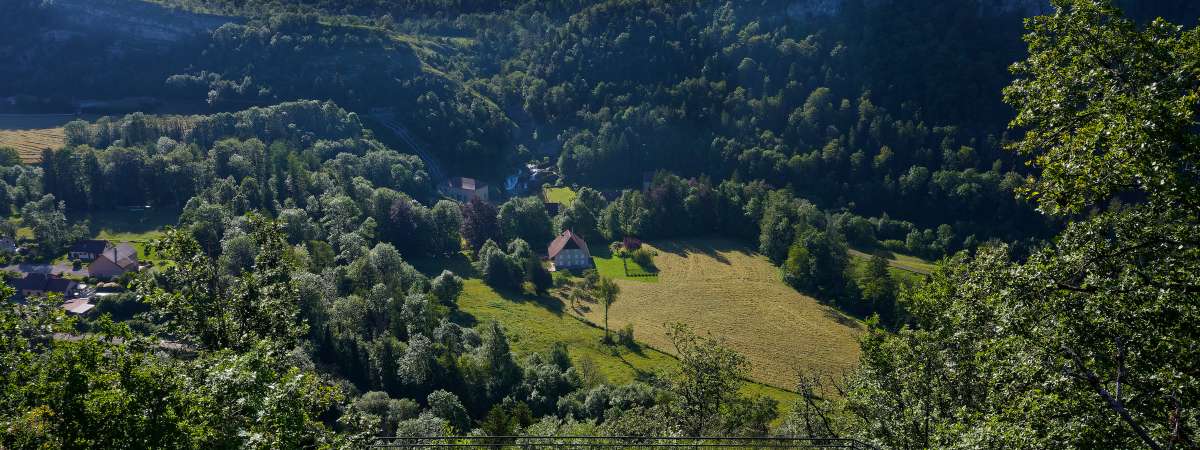Un circuit pour découvrir le bois de Sapois et apprécier la vue depuis le belvédère du Vanteur sur les Pertes e l'Ain et la vallée de l'Ain.