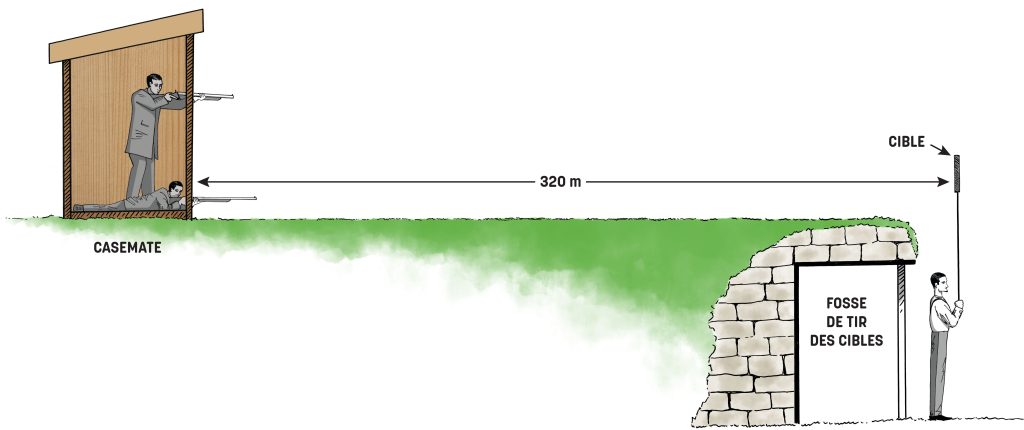Les tireurs étaient ainsi postés relativement loin des cibles d'entraînement, côté sud, dans la casemate. Cette dernière, décrite comme une cabane rustique au plancher de bois, facilitait, entre autres, le tir couché. En face, la fosse était constituée d'un abri enterré, maçonné et cimenté qui protégeait les personnes en charge du maniement des cibles. Les séances de tir se déroulaient avec des fusils de guerre (à balles réelles).