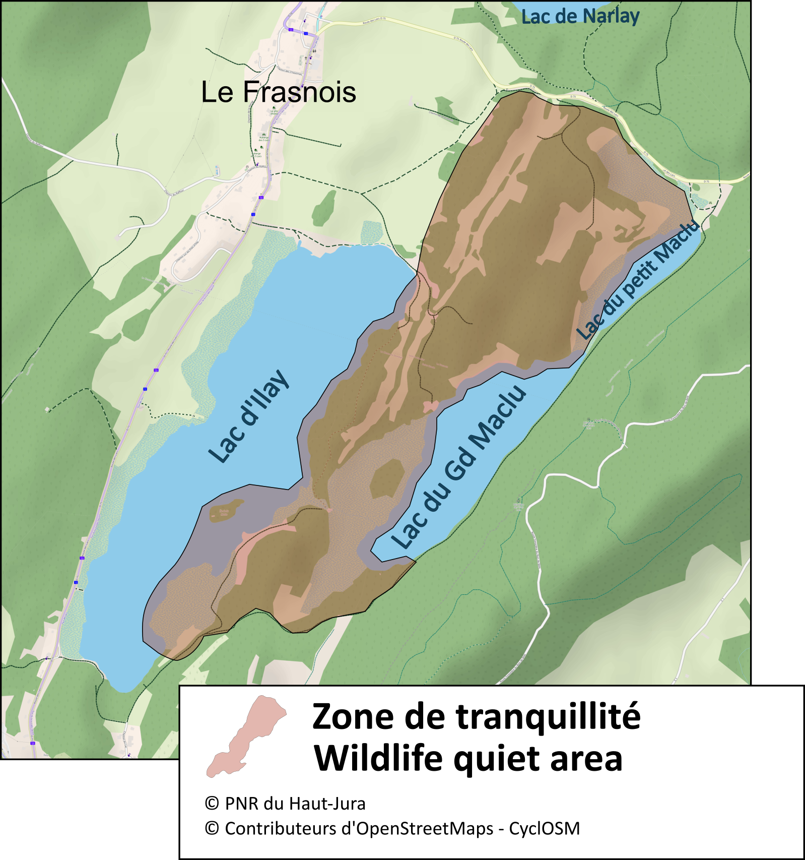 Site remarquable, classé Natura 2000 et site Ramsar « Tourbières et lacs de la montagne jurassienne », le Lac de Narlay comme l’ensemble des 4 lacs accueille de très nombreux visiteurs. Pour préserver l’équilibre du site et ses patrimoines naturels, une zone de tranquillité volontaire est instaurée du 15 avril au 15 septembre (en marron sur la carte). Elle permet de limiter le dérangement des espèces animales en période de reproduction et d’élevage des jeunes, d’empêcher le piétinement, et de préserver la quiétude des différents milieux naturels.