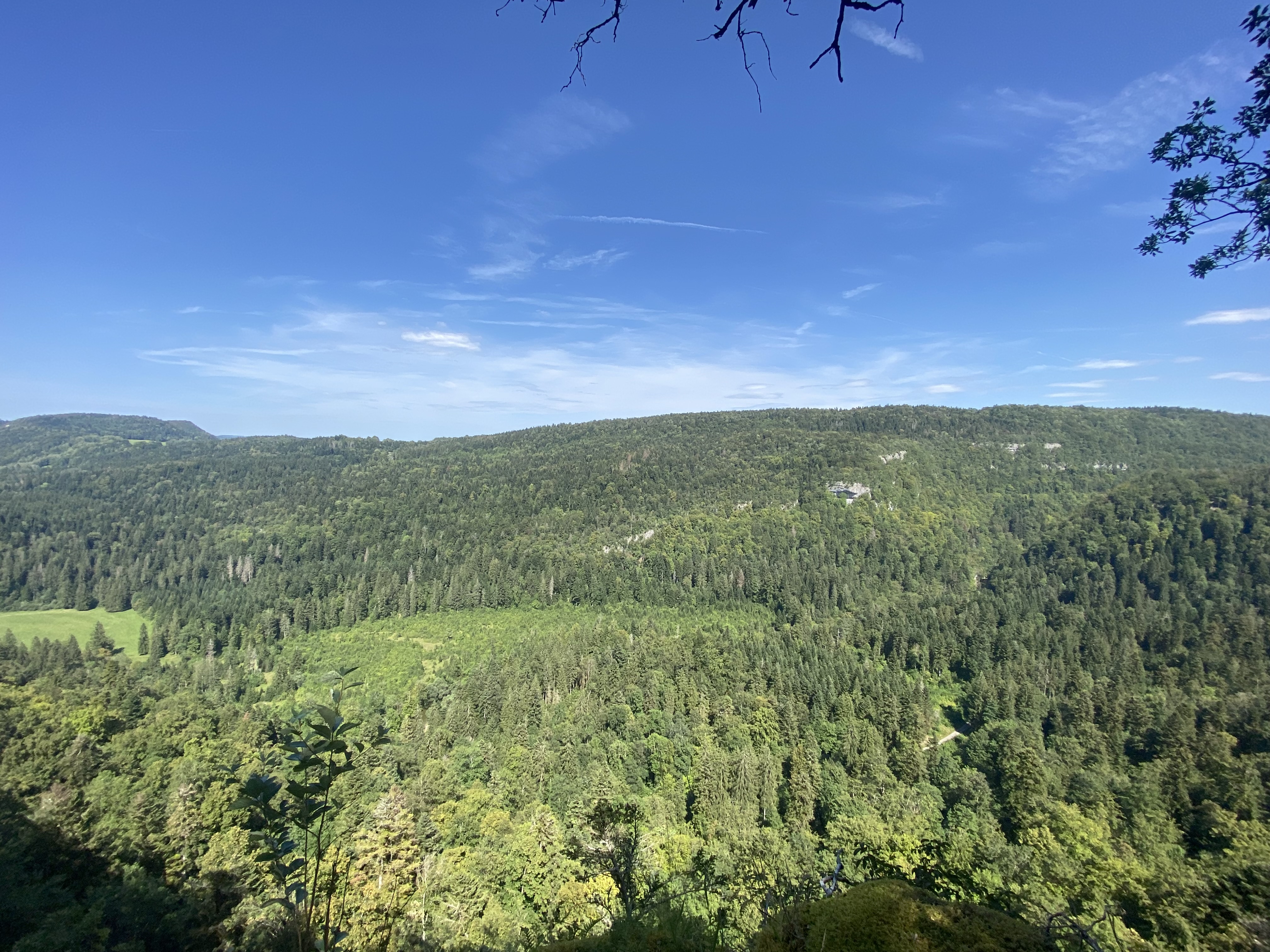 Situé sur le flanc est du plateau de Chaux-des-Crotenay, ce point d'observation offre une vue privilégiée sur la rivière de la Saine qui s'échappe de la vallée escarpée des Côtes chaudes et serpente à travers le « Pré Grillet ».