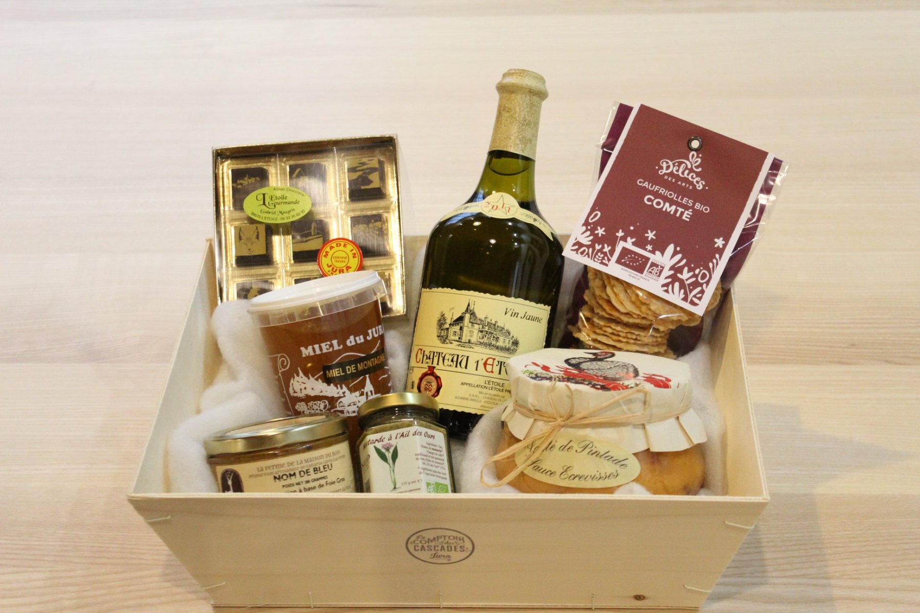 Au « Comptoir des Cascades », vous trouverez forcément votre bonheur : Aude et Anthony Negrello sélectionnent avec soin de nombreux produits régionaux de qualité, qui représentent dignement la gastronomie locale. Vins jurassiens, fromages et laitages, charcuterie, limonade artisanale, épicerie fine, pain, pâtes, biscuits, chocolats, glaces, miel... Judicieusement conseillés par Aude, qui connaît ses produits sur le bout des doigts, vous pourrez vous faire plaisir en confectionnant une corbeille garnie de spécialités du terroir.
