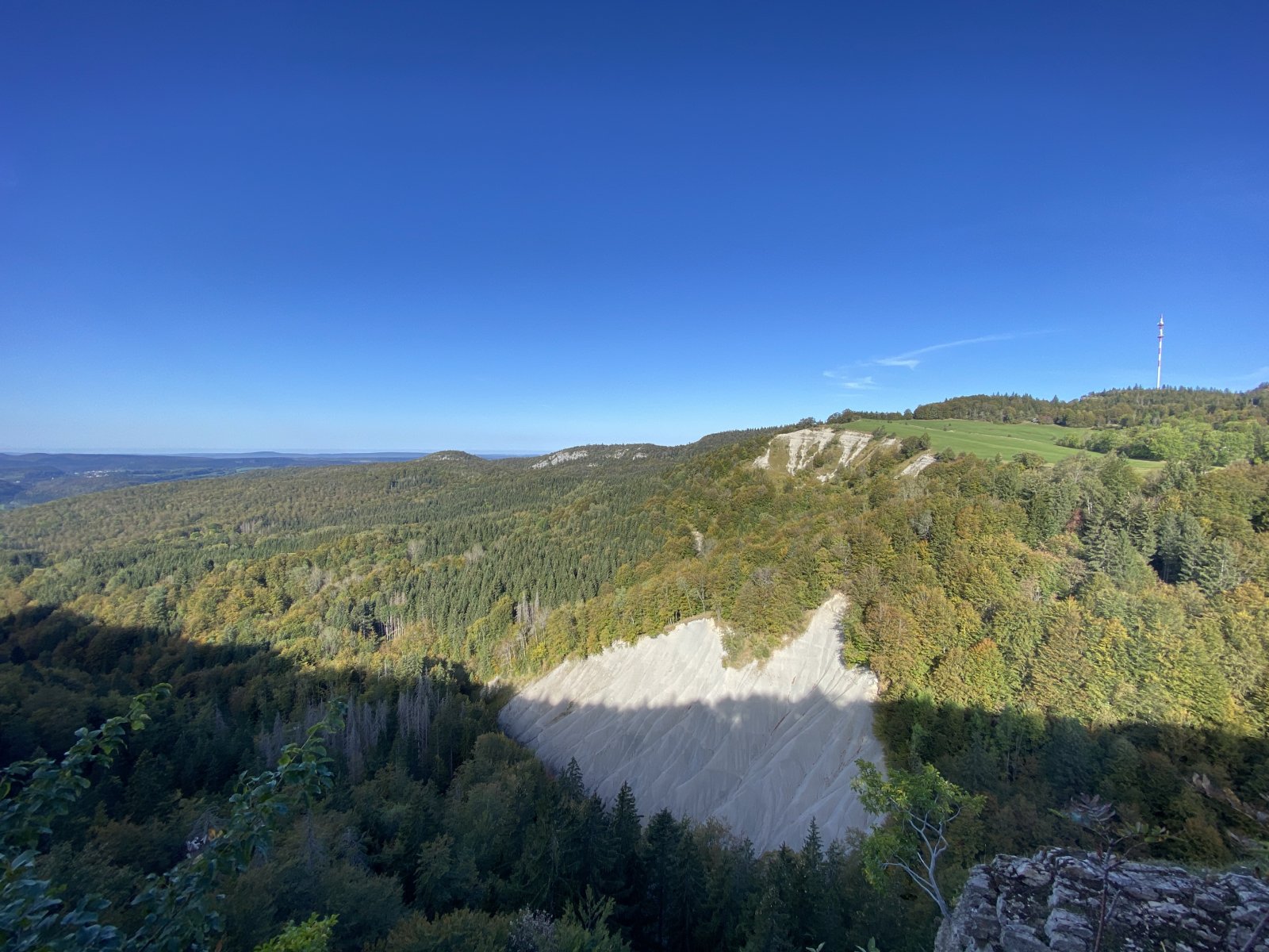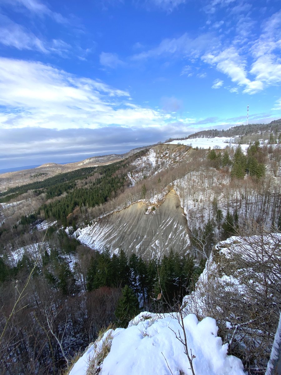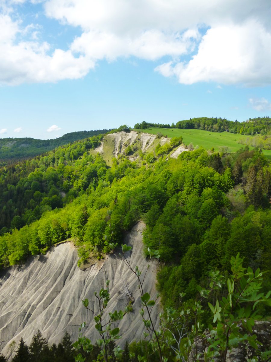 Mais cette brèche insolite n’est pas la seule curiosité naturelle du site : en contournant la Roche Fendue jusqu’au belvédère, on peut également observer l’érosion d’une couche de marne grise, réactivée à chaque averse. Le ruissellement des pluies emporte l’argile et façonne ce gigantesque pan de roche calcaire sur plus de 100 m de hauteur, en creusant régulièrement de multiples ravines.