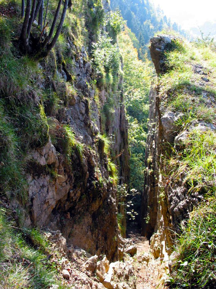 Aux alentours de Foncine-le-Haut, le belvédère de la Roche Fendue domine la magnifique combe du Paradis et offre une vision particulièrement spectaculaire de l’érosion géante d’une couche de marne, sur le flanc du ravin des Arboux.