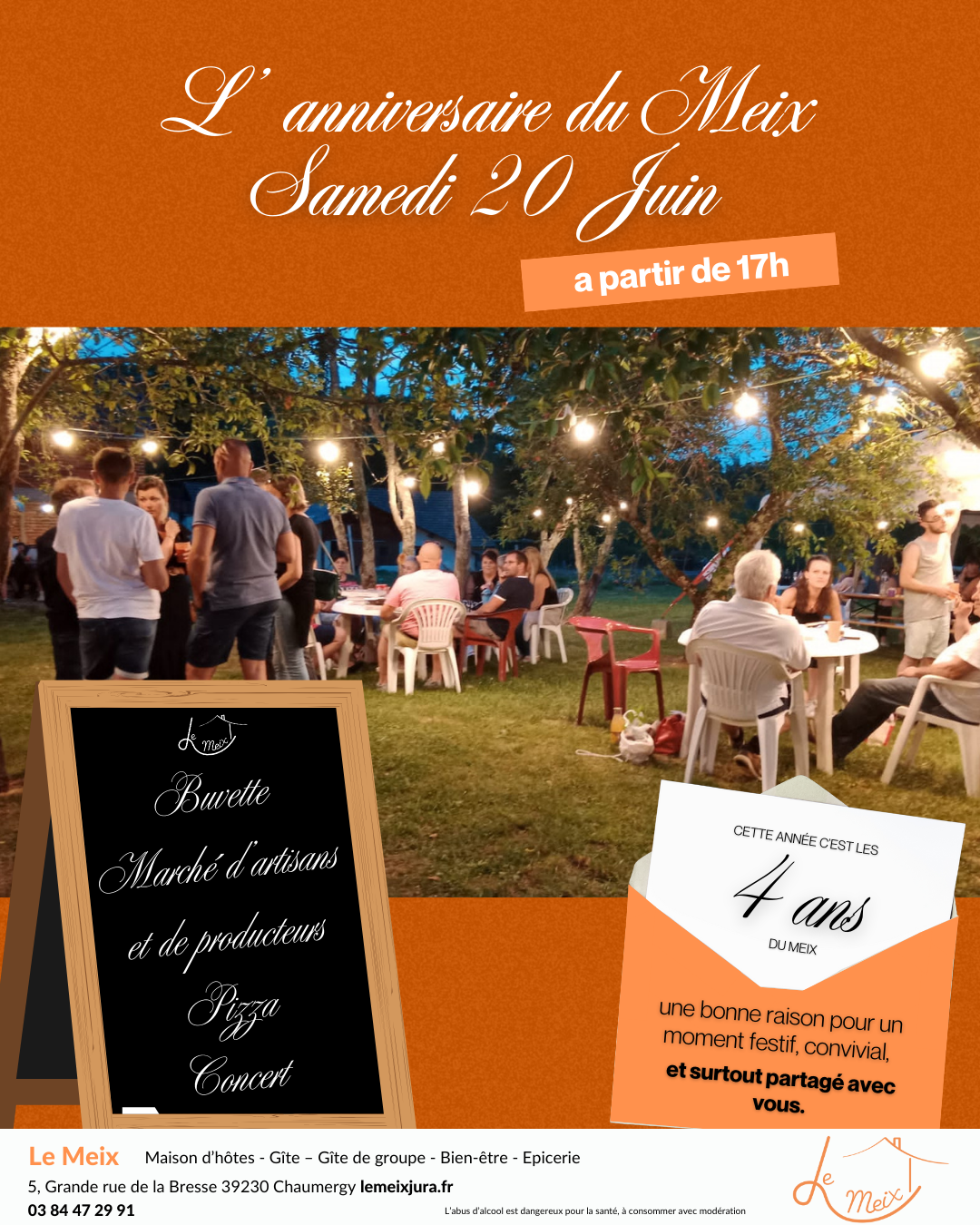 Venez fêter la maison d'hôtes Le Meix Jura à Chaumergy ! À partir de 17h00, venez découvrir un marché de producteurs (confitures, miels, fromages, couture, massage...), visite des chambres d'hôtes, du centre de bien-être, buvette et restauration avec Piz'zah Chapo ! Profitez d'un concert pour prolonger la soirée !