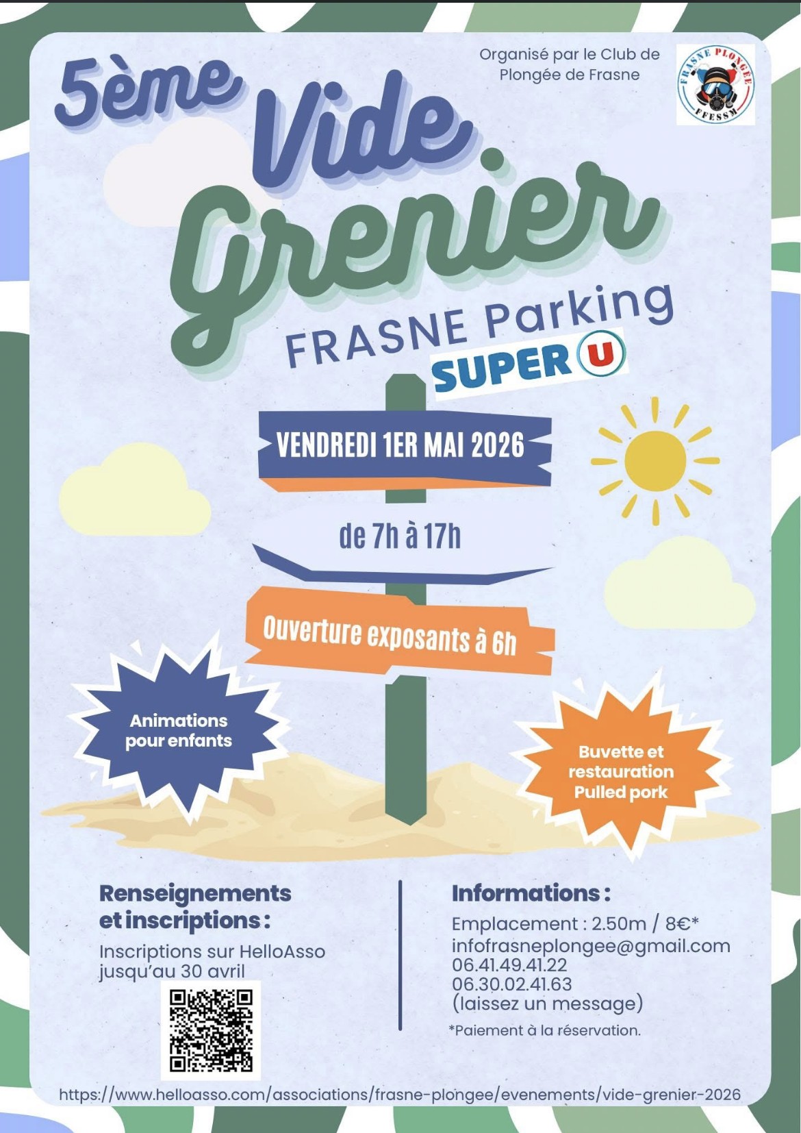 Organisé par le club de plongée de Frasne. Buvette, restauration pulled pork et animations pour enfants sur place.