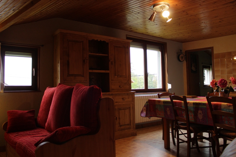 Logement au 2ème étage de la maison des propriétaires avec entrée indépendante. Cuisine-séjour, ch1: 1 lit 2 pl, 1 lit 1 pl, ch2: 1 lit 2 pl, ch3: 1 lit 2 pl, salle d'eau avec douche, WC indépendant à l'étage. Cour et jardin non clos, salon de jardin, barbecue. Chauffage central et électrique. Charges non comprises (consommation moyenne : 20 à 30 € en hiver/semaine). A disposition: lit et chaise bébé, balançoire. Possibilité de rando raquette nocturne ou journée avec le propriétaire (sur demande). Ferme à 150m. terrain de jeux dans le village. Table de ping-pong à disposition. Forfait ménage 100€ pour les sociétés. Parking privé sur place.