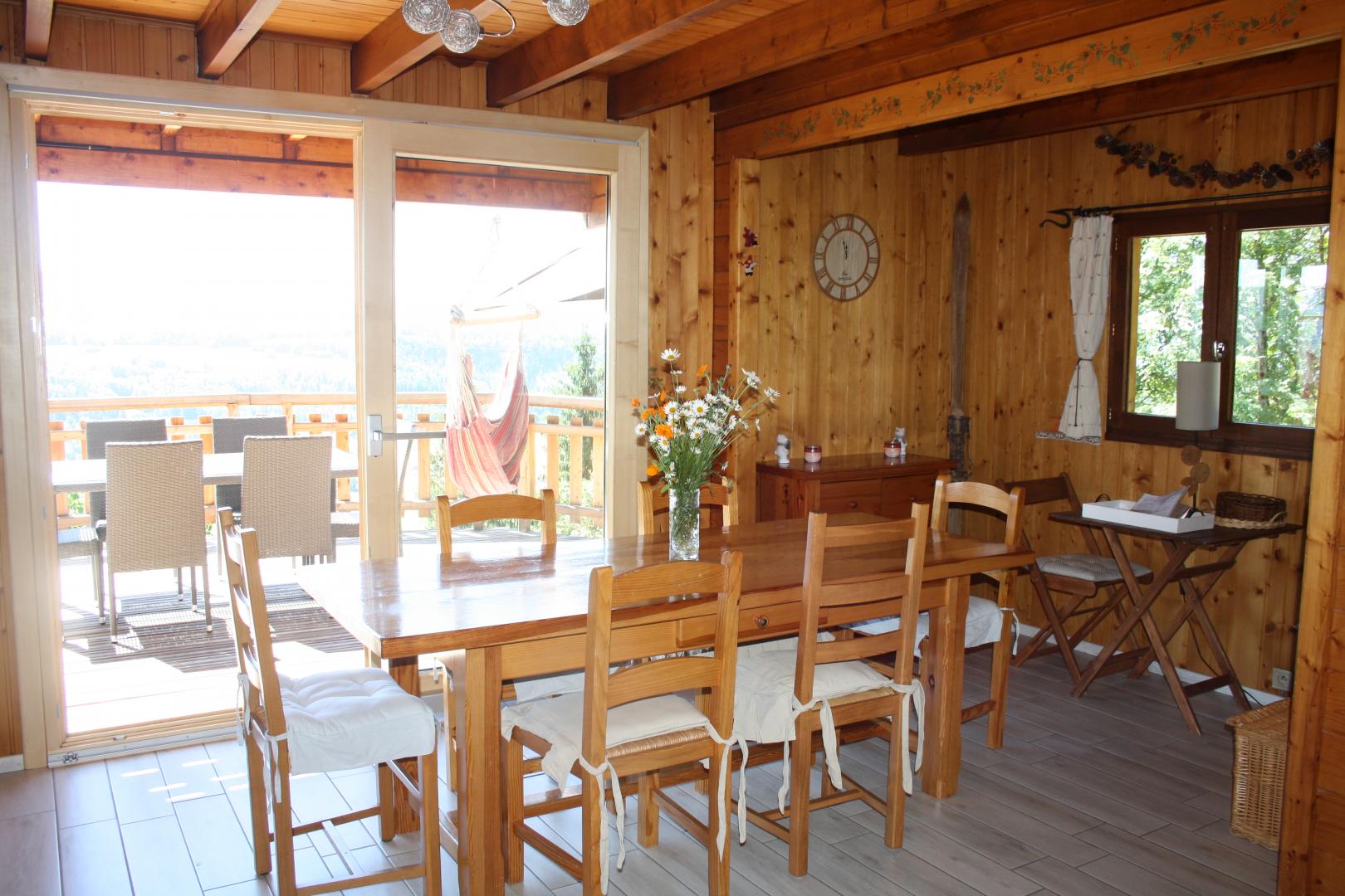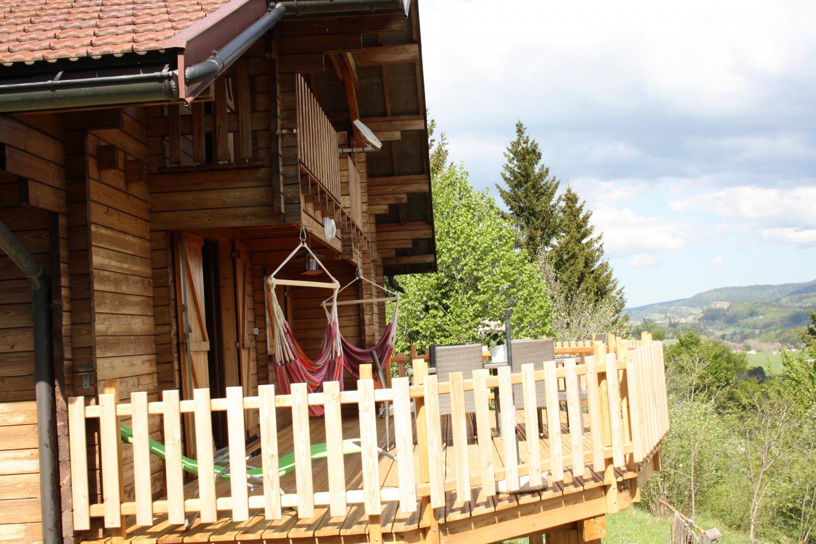 Chalet bois avec vue imprenable sur la vallée de Foncine le Haut. Au RDC : belle pièce à vivre lumineuse avec petit coin détente devant la cheminée, espace cuisine et salle à manger, une 1ère chambre avec 1 lit en 140x190. Salle d'eau avec douche, 1 wc indépendant. A l'étage : mezzanine avec coin salon, TV, 2ème chambre avec 1 lit en 160x200 et une 3ème chambre avec 1 lit en 140x190 et un lit en 90x190. Le gîte dispose d'un garage fermé + un local pour ski, vélo, poussette,....Terrain attenant non clos avec table de jardin et barbecue. En hiver, venez profiter de la station de ski familiale de Foncine. En été, vous pourrez apprécier les nombreux sentiers de randonnée au départ du gîte. A découvrir !