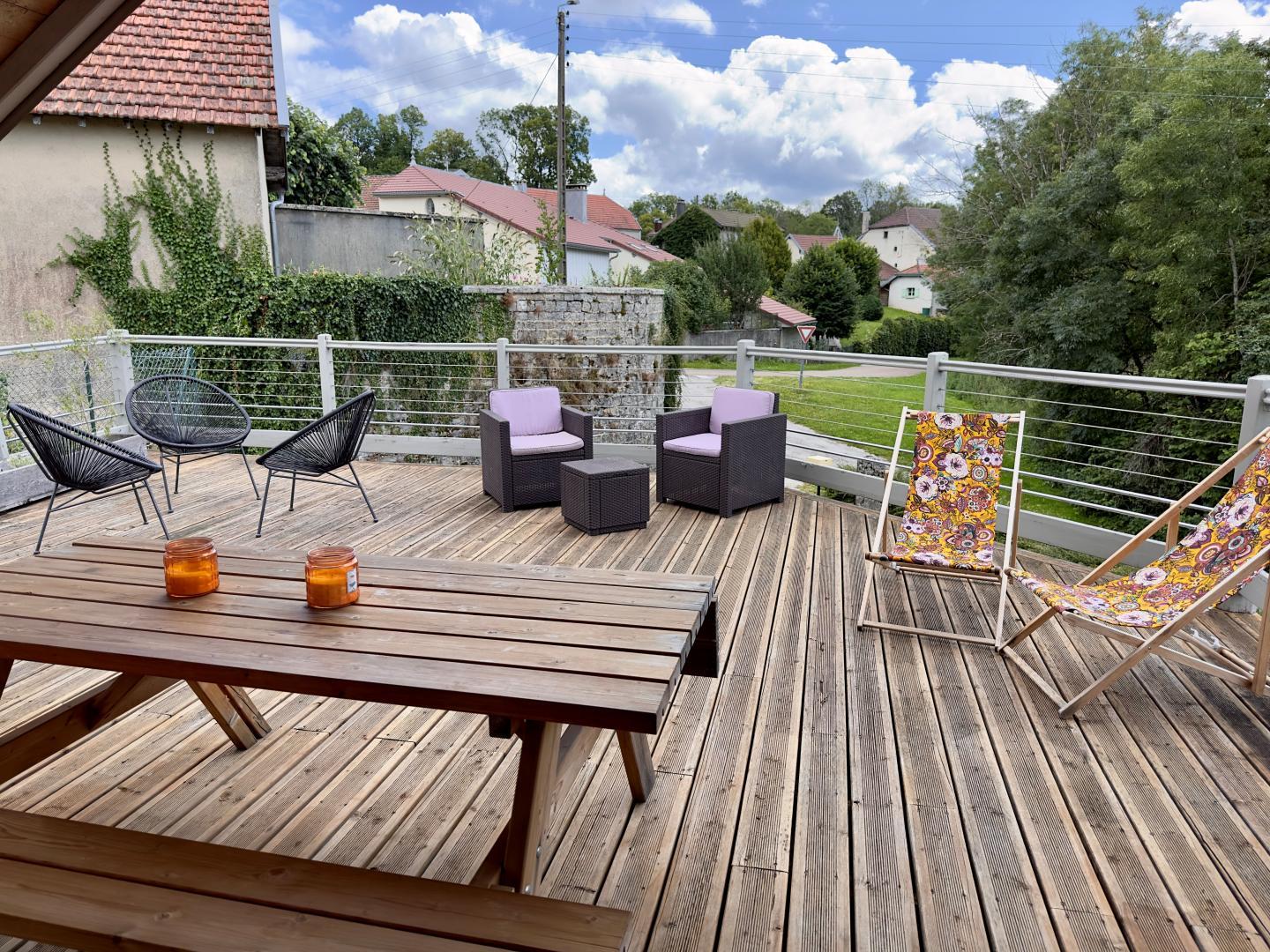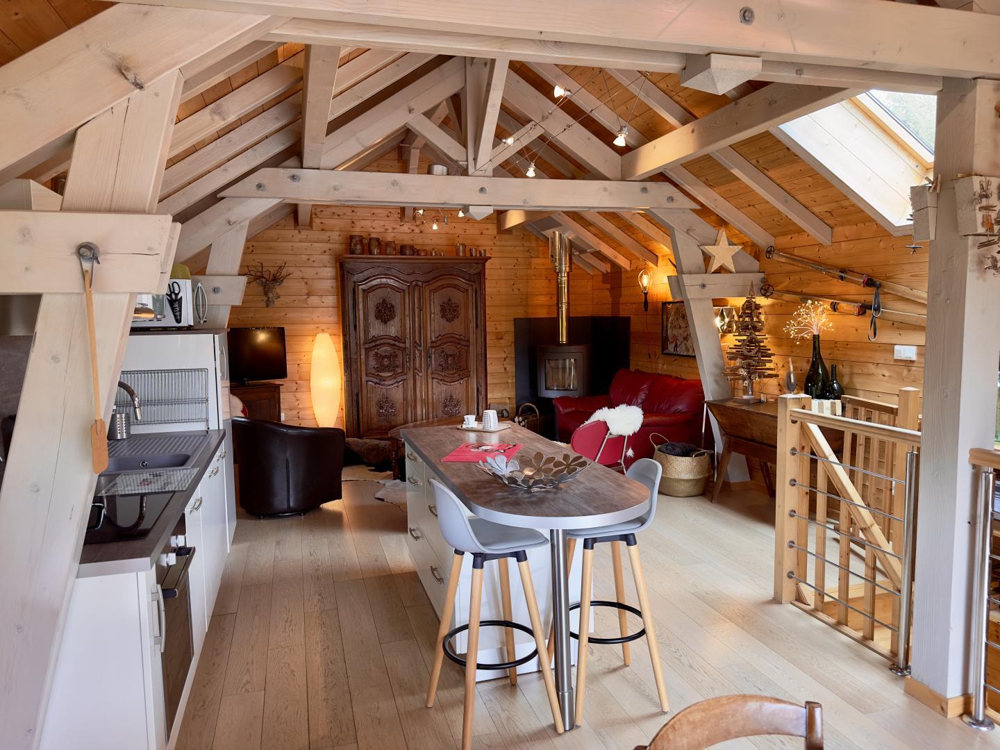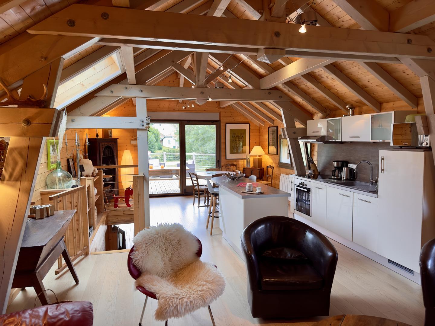 Chalet au charme original et design au centre du village de Châtelneuf, sur l'axe Champagnole-Genève. Vous vous trouvez dans une région calme où chaque saison a ses attraits : ski, randonnée, baignade, cascades, mycologie. Votre location de vacances, entièrement rénovée et tout confort, dispose d'une cuisine équipée, coin salon avec poêle à bois et accès à une vaste terrasse extérieure exposée au Sud. Au rez de chaussée, vous trouverez une chambre avec 1 lit 2 places, une chambre avec 2 lits superposés, salle de bain, wc indépendant. Cour et jardin en partie clos, abri voiture et appentis. Animaux non admis. Option ménage : 70€. Fourniture de bois : 5€ le casier (un panier offert). Merci d'apporter vos draps et linge de toilette. A 10 km : courses, baignade, randonnée, VTT, pêche, équitation, tennis. A 20 km : canoé, golf, ski de fond. A 50 km : ski alpin, via ferrata