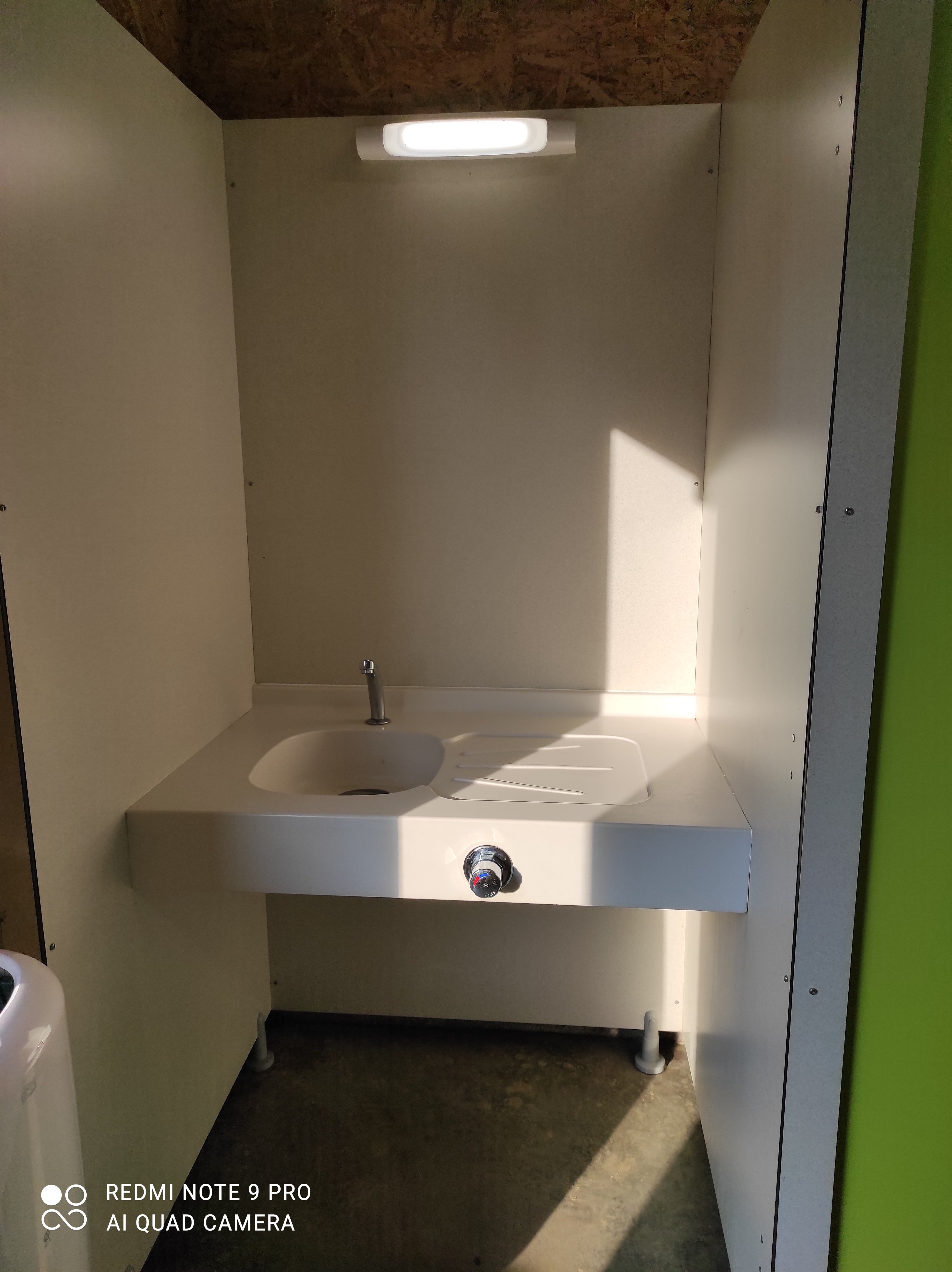 Sanitaires accès PMR, douches, WC, lavabos, éviers. Évacuation des eaux usées. Eau, électricité.