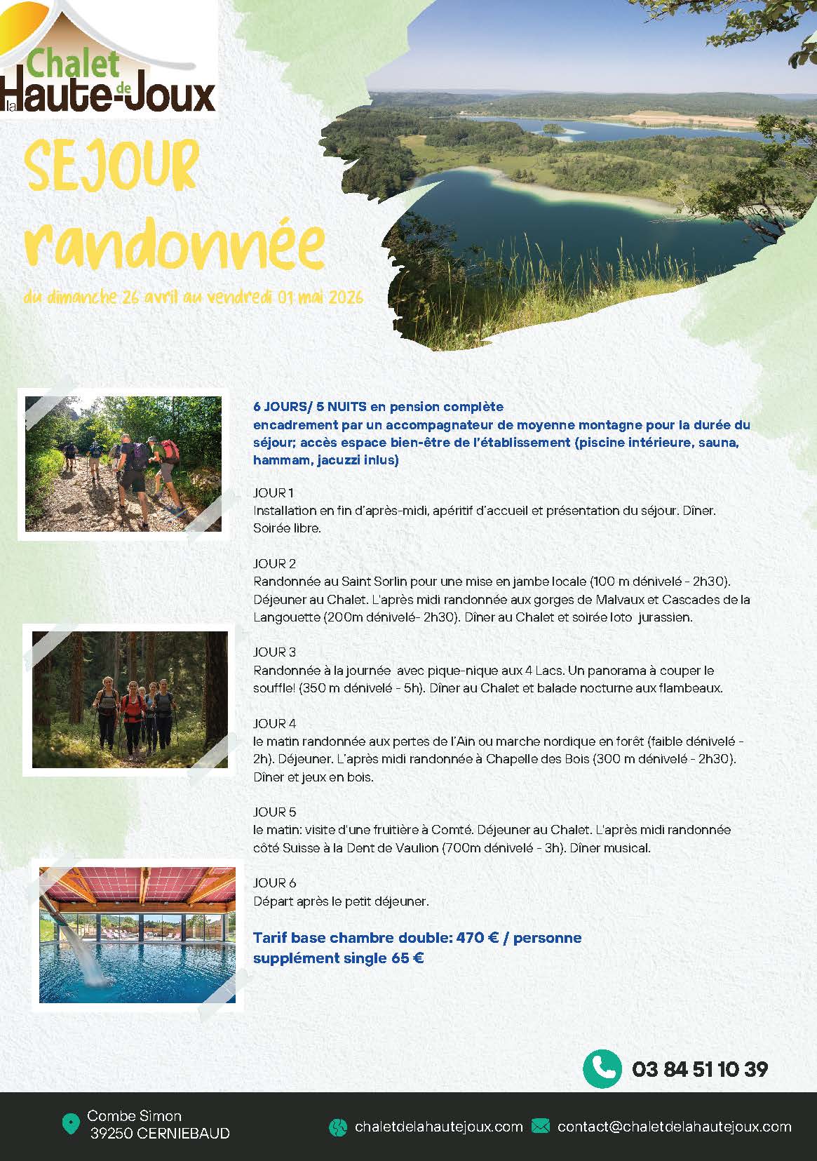 Encadrement par un accompagnateur de moyenne montagne pour la durée du séjour ; accès espace bien-être de l’établissement (piscine intérieure, sauna, hammam, jacuzzi inlus)