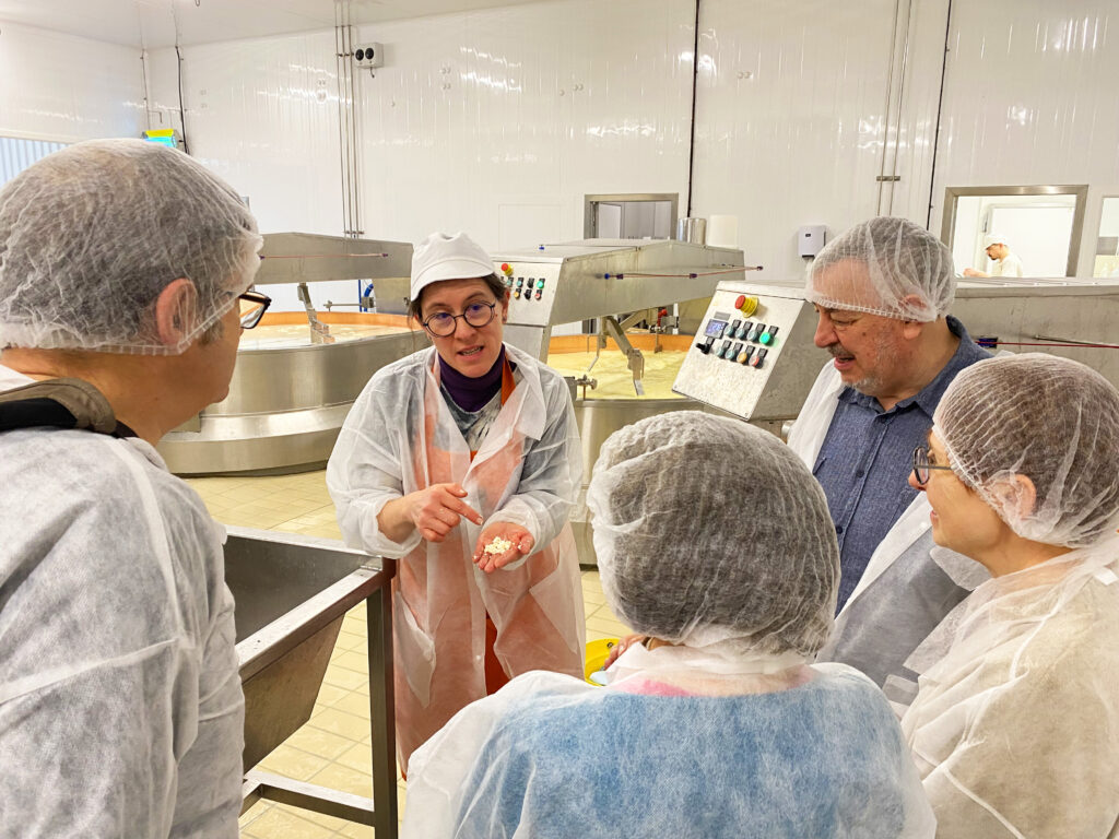 Après s'être équipés d'une charlotte, d'une blouse et de sur-chaussures, direction l'atelier de fabrication ! La visite, qui permet d'observer les gestes précis des fromagers, débute par l'explication du processus de fabrication du Comté.